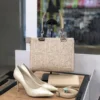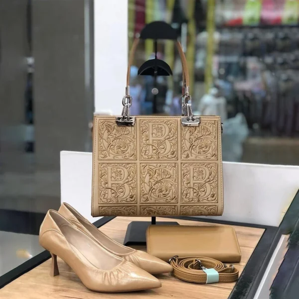 Design: Grid-patterned floral embossing with a central “B” motif and silver-tone hardware.