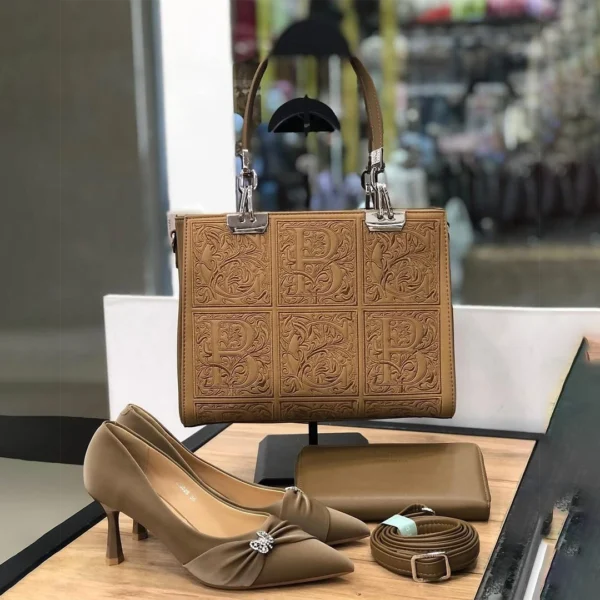 | Camel / Tan | A warm, medium-toned tan. This set includes matching leather heels with a slight gathered texture at the toe. | |